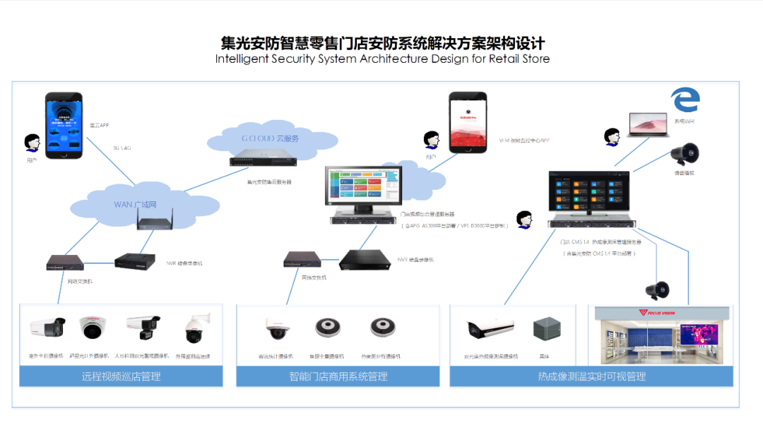 JIUYOU.COM-九游安防双光智能警戒系统 支持门店部署,摄像机部署于门店出入口, 除可满足门店视频监控功能外,当顾客进店时,该系统可第一时间通过前沿人形检测视频分析技术识别顾客进店状态,按后台预设欢迎语播报欢迎语音进行提醒,便于店员及时提供接待服务,提升门店新老顾客进店的体验及满意度,系统支持JIUYOU.COM-九游安防G-Cloud集云移动客户端远程视频管理、报警邮件推送。