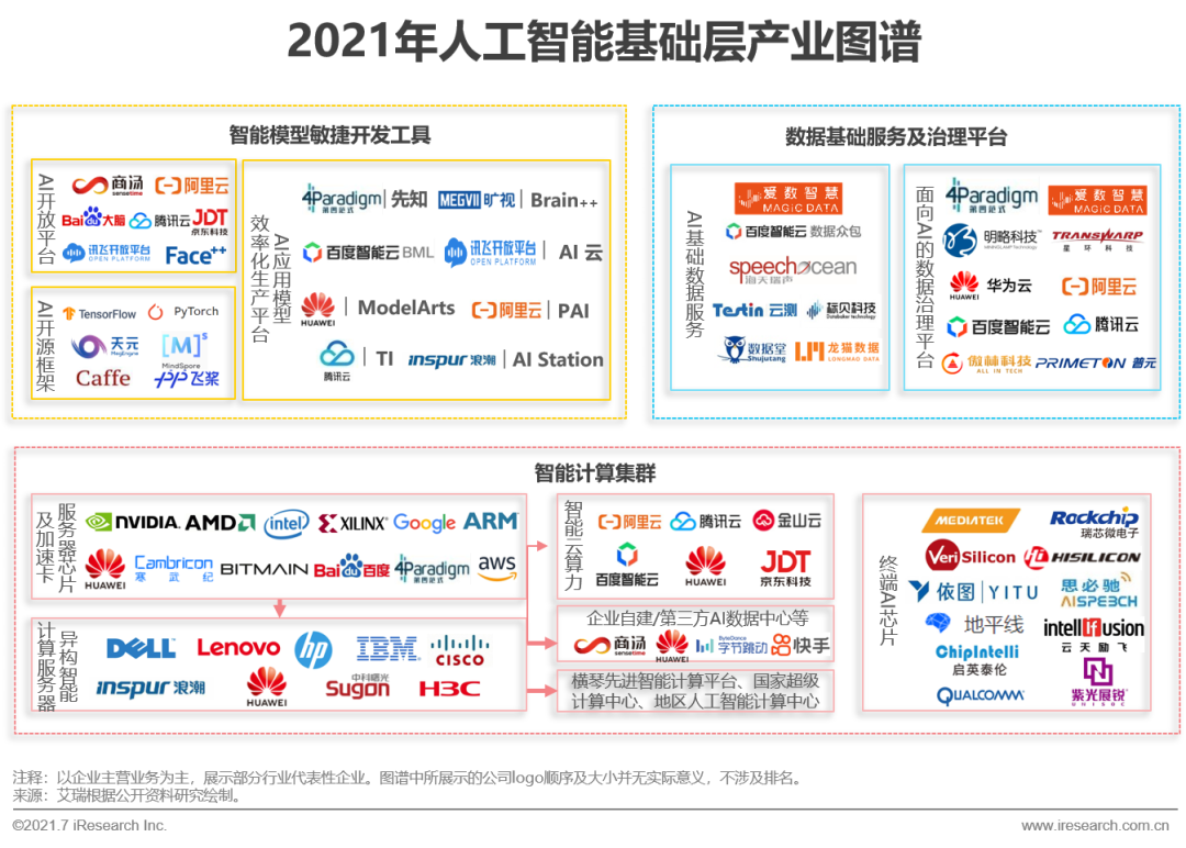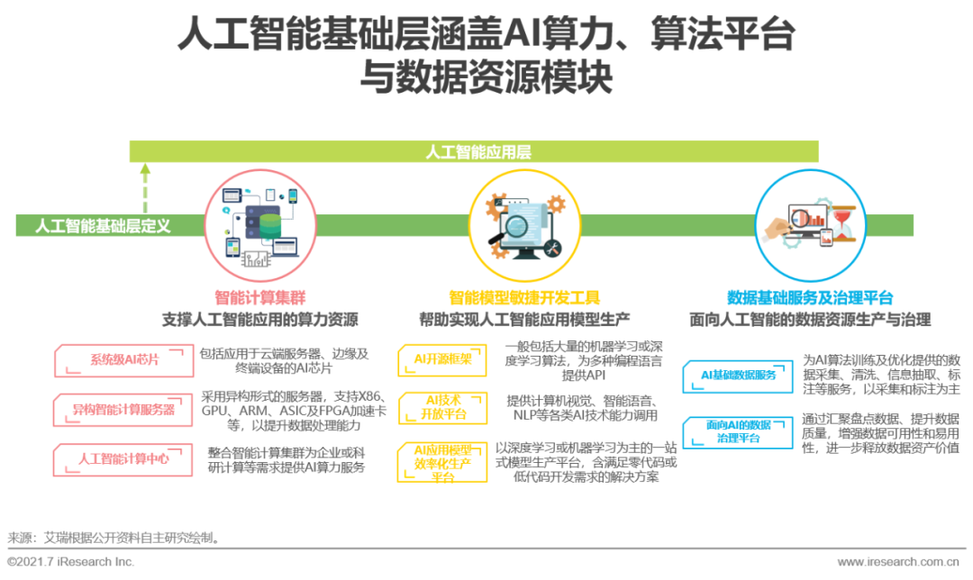算力、算法、数据是人工智能产业发展的三大要素。据此,人工智能基础层主要包括智能计算集群、智能模型敏捷开发工具、数据基础服务与治理平台三个模块。智能计算集群提供支撑AI模型开发、训练或推理的算力资源,包括系统级AI芯片和异构智能计算服务器,以及下游的人工智能计算中心等;智能模型敏捷开发工具模块主要实现AI应用模型的生产,包括开源算法框架,提供语音、图像等AI技术能力调用的AI开放平台和AI应用模型效率化生产平台;数据基础服务与治理平台模块则实现AI应用所需的数据资源生产与治理,提供AI基础数据服务及面向AI的数据治理平台。AI基础层企业通过提供AI算力、开发工具或数据资源助力人工智能应用在各行业领域、各应用场景落地,支撑人工智能产业健康稳定发展。